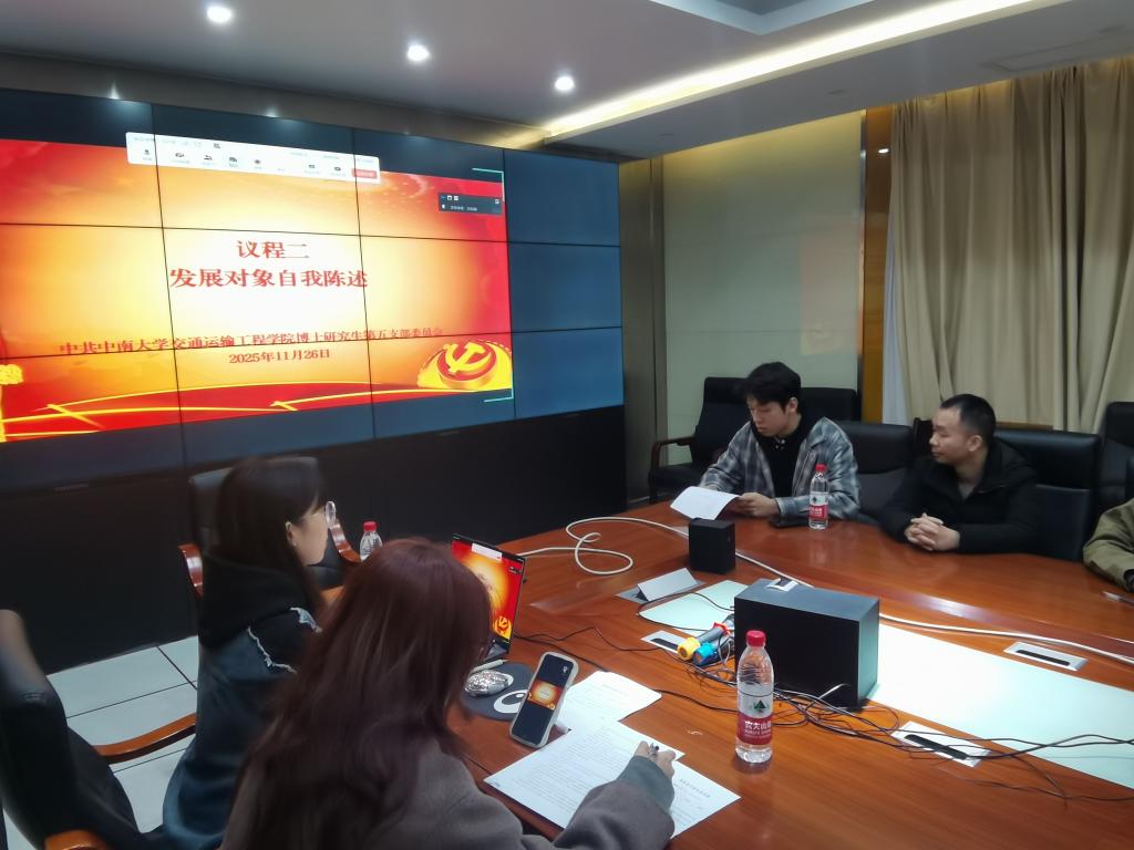 博士研究生第五党支部在交通楼518会议室隆重召开支部党员大会。本次会议由党支部副书记王钰涵同志主持,主要议程包括讨论接收文梦凡同志为中共预备党员以及集中学习党的二十届四中全会精神,会议应到有表决权党员21人,实到17人,线上参会4人,根据《中国共产党章程》和《中国共产党发展党员工作细则》的有关规定,符合法定开会人数。