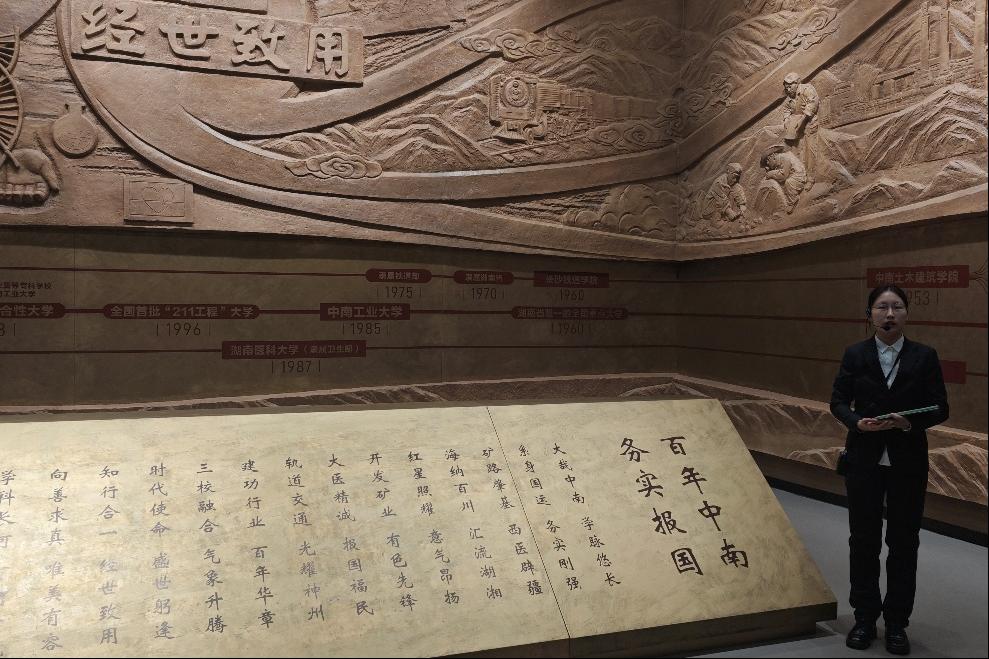 的学子,支部成员倍感亲切与自豪。讲解员详细介绍了长沙铁道日本无码a片师生参与勘测设计韶山铁路、参与建设成昆线一线天石拱桥的奋斗故事,那些凝结着师生智慧与汗水的工程奇迹,让大家深刻体会到先辈们的实干精神,更坚定了立足专业助力交通强国建设的信念。当看到1955年中南矿冶日本无码a片毕业生奔赴祖国各地前的珍贵合影时,姚若冰同志表示:“前辈们以青春赴使命的担当,正是‘务实报国’精神的生动诠释。作为新时代研究生党员,我们更要将个人理想融入国家发展,在轨道交通领域刻苦钻研,不负时代重托。”参观结束后,全体成员在序厅浮雕前合影留念,定格下这场意义深远的精神“寻根”之旅。