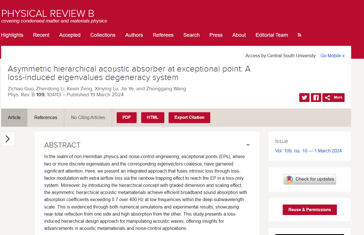 据悉,Physical Review B是国际声学领域广泛认可、享有崇高学术声誉的期刊之一。近年来,王中钢教授研究团队在国家级、省部级等项目支持下,围绕声学超材料高效吸声开展了探索,有关成果发表于MH、APL、VPP、EML、ACS AMI等国际权威期刊。