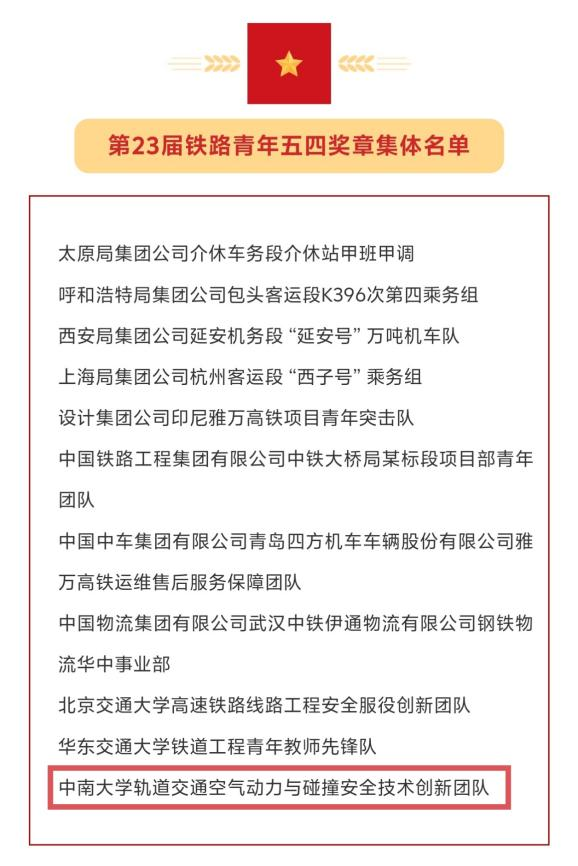 轨道交通空气动力与碰撞安全技术创新团队获评“铁路青年五四奖章集体”,全国仅三个高校团队获此荣誉。