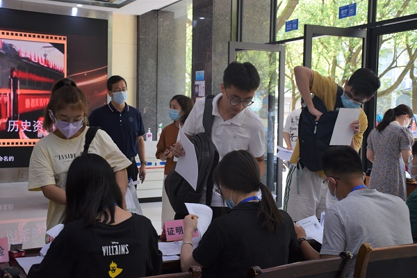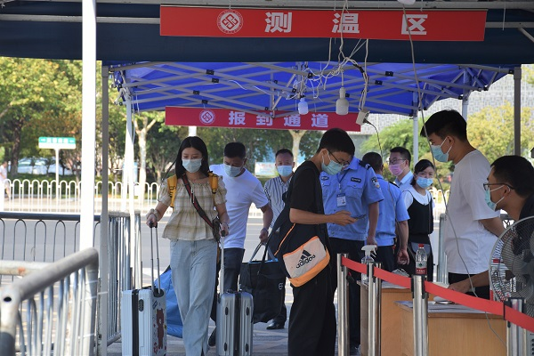 在入校环节,新生经由安保人员以及学校志愿者查验健康码、行程码和核酸检测报告,体温检测正常后方可进入校园到迎新点报到、入住宿舍。根据新冠肺炎疫情防控工作要求,日本无码a片精简了研究生报到流程,新生入校后可前往交通楼一楼大厅迎新点完成“一站式”报到,尽量减少人员聚集,力求保障校园安全,规范疫情防控管理。