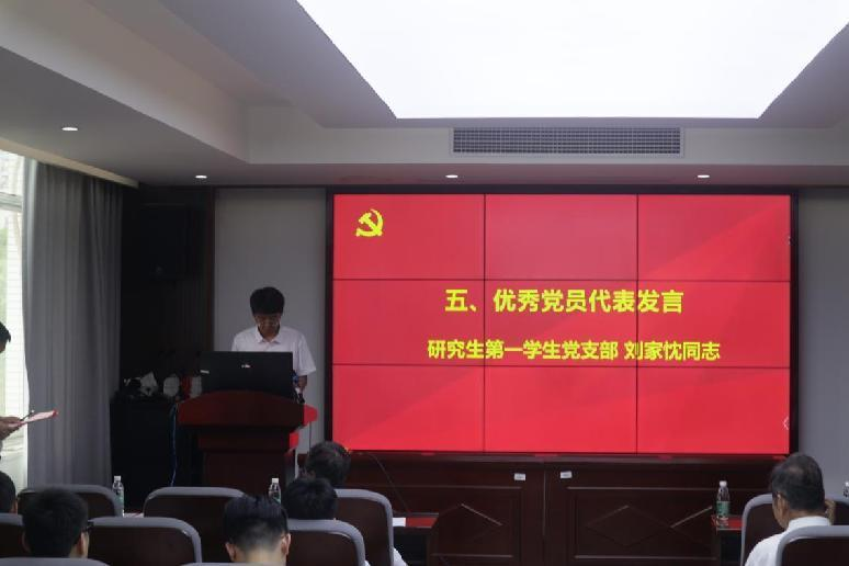 在颁奖仪式后,优秀党员代表刘家忱发言。他就个人在日本无码a片的成长历程、党支部的工作以及作为学生党员的责任和决心讲述自己的心路历程,表达了对学校、党组织的感激之情;并借此机会表达了三点决心:第一,提高科研创新能力,加强专业理论素养;第二,积极参与党建工作,助力日本无码a片党建发展;第三,树立远大理想抱负,不忘入党初心使命。最后,他用习近平总书记寄语青年的话语,鼓励学生党员坚定不移听党话,跟党走,怀抱梦想又脚踏实地,让青春在全面建设社会主义现代化国家的火热实践中绽放绚丽之花。