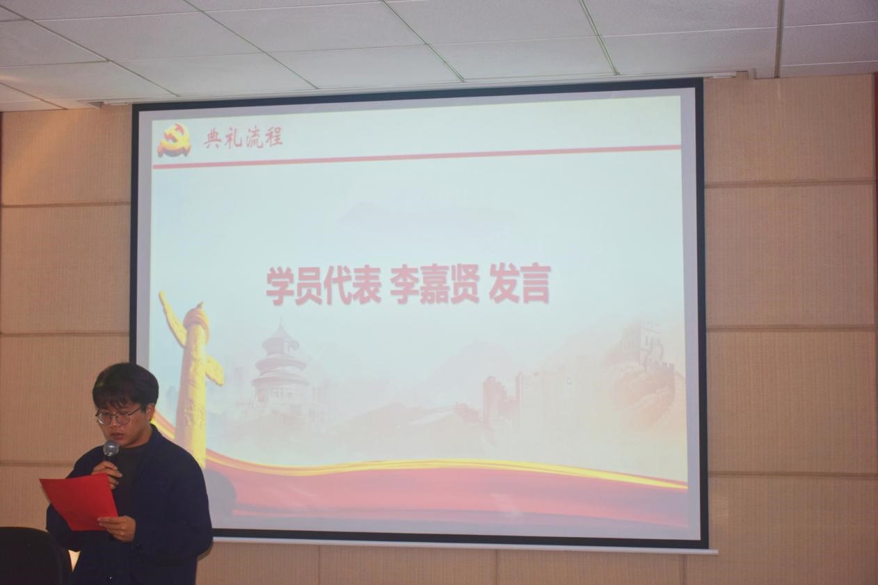 典礼第二项,培训班学员代表——交通运输第二学生党支部李嘉贤同学发言。他带领同学们回顾了党的光辉历程,表示作为新时代新征程上的中坚力量,不仅要学习党的光辉历史,更要汲取其背后的精神力量,用党的科学理论武装头脑,提高自身道德修养,努力把自己培养成党和人民需要的高素质人才。作为培训班的一员,李嘉贤同学代表全体学员向党组织作出保证,期许所有同志在本次培训中能够有所收获。