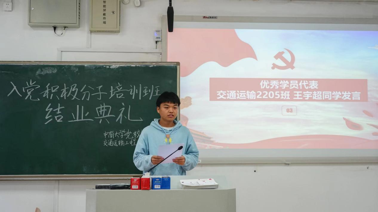 典礼第三项,培训班优秀学员代表王宇超发言。他首先对校党委和院党委提供如此宝贵的学习平台表示衷心感谢,随后回顾了培训期间的所作所为、所思所想,号召同学们保持谦虚谨慎的态度,提高政治觉悟和思想水平,携起手来为实现中华民族伟大复兴而努力奋斗。