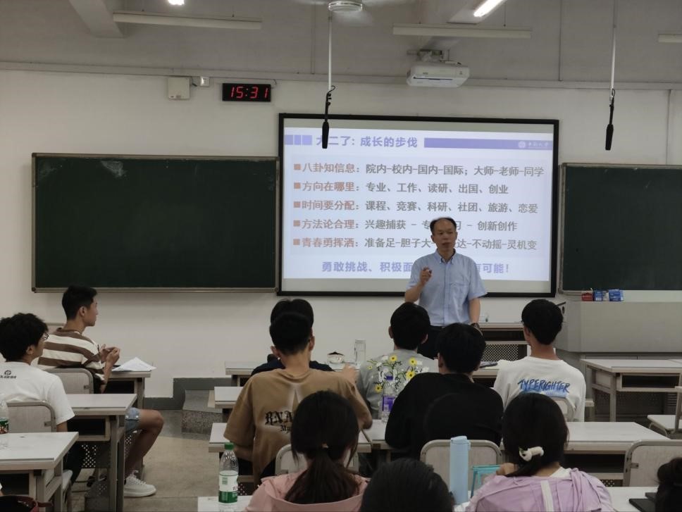 黄合来院长在班会上以“成长的步伐”为主题,从五个关键点入手,引导学生树立正确的理想目标。首先,他鼓励学生在大学阶段“主动出击”,以学术“八卦”的态度从多维度、多方面汲取可用信息。其后,他强调了方向选择的重要性,并以深入浅出的方式介绍了专业、工作、读研、出国和创业等选择的特点和现状,通过举例推演学生成长发展路线,帮助学生更好地规划未来路径。他表示,时间分配合理性是取得成功的关键,面对课程、竞赛、科研、社团、旅游和恋爱等六个方面,他建议学生在学有余力的情况下有选择地参加,以兴趣为根本,以锻炼能力为目标,追求全方位地发展。第四,在方法论方面,他强调了兴趣捕获、专业学习和创新创作的重要性,以自身经历启发学生明晰正确的方法论,帮助学生阶段性地进步。最后,黄合来院长鼓励在场学生勇于表达、坚守初心、善于灵活变通。