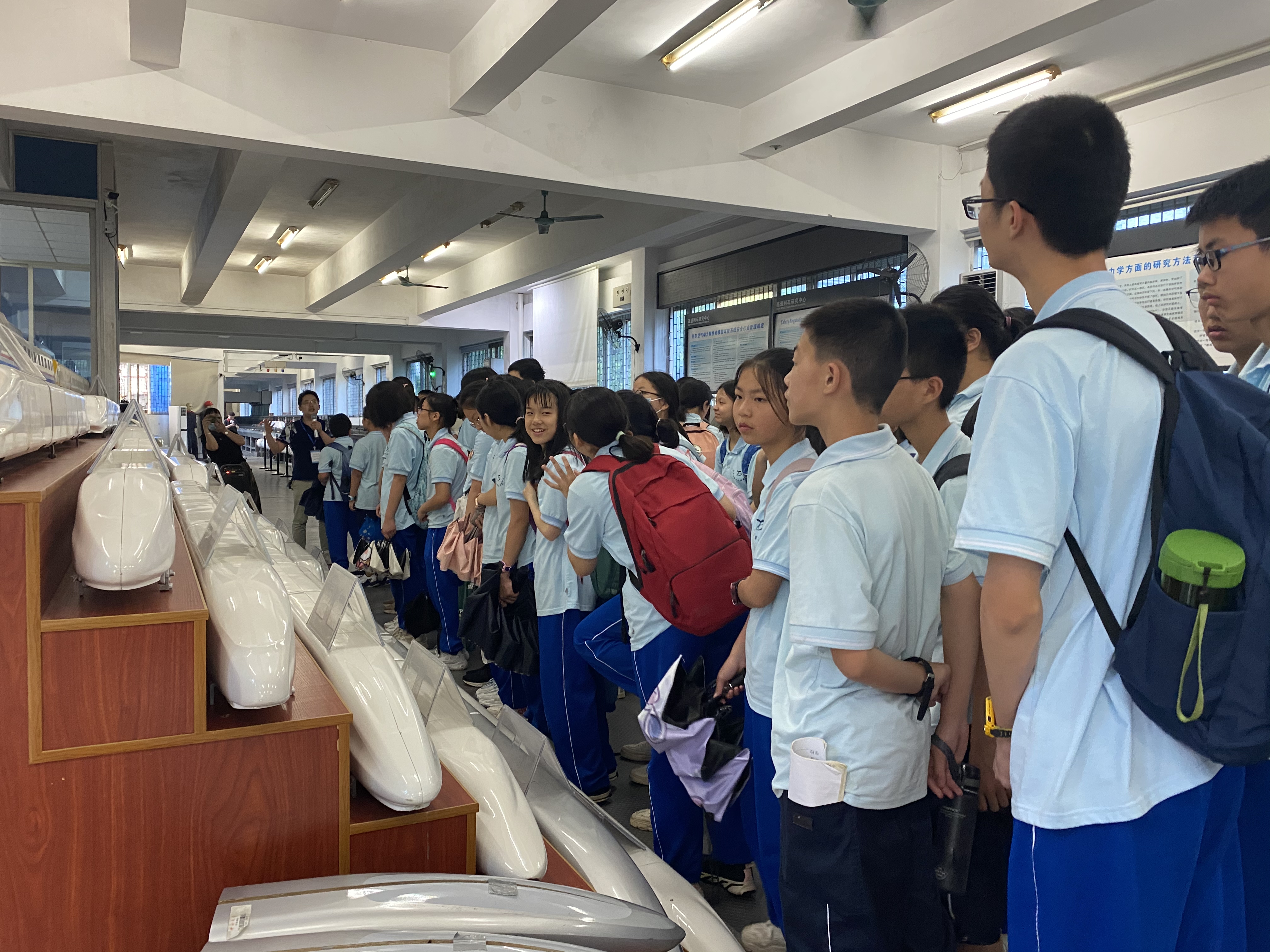 在列车动模型实验室,伍钒老师为大家科普了动模型实验台的运作原理,并介绍了我国高速列车发展的主要阶段及空气动力性能变化。现场动模型弹射交汇。