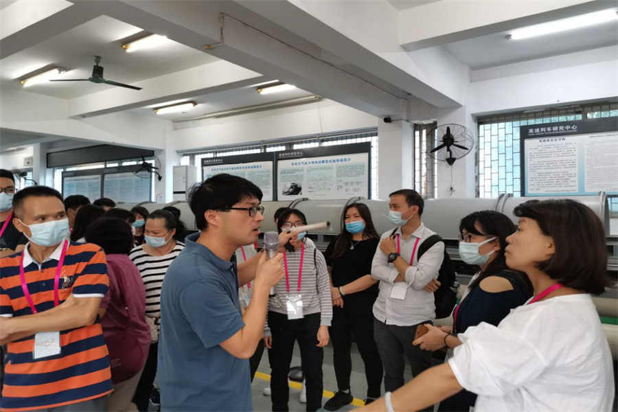 轨道交通安全教育部重点实验室,拥有自主设计、世界规模最大、国内第一的“高速列车空气动力学动模型试验台、实车撞击试验台”,在列车空气动力学和列车撞击动力学两个学科领域取得了国际领先的研究成果,先后承担过国家及铁道部高速列车、提速列车和磁悬浮列车研制等一系列课题。2位老师的讲解让代表团成员对我国的高速列车相关研究发展有了具体的认识,一些成员就老师讲解的内容提问、积极与老师讨论交流。在参观过程中,高速中心的工作人员还为代表团演示了高速列车空气动力学动模型弹射试验,让大家体验到高速列车速度之“快”。