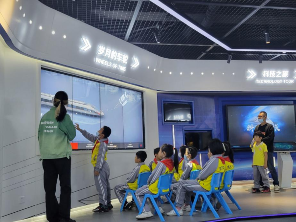 先进轨道交通科普馆。科普馆的志愿者以时代的车轮为主题,逐一讲解了馆内各部分的内容。在讲解伊始,大家一同观看了“风一样的团队”宣传片。该宣传片展现了科研团队在铁路行业克服的种种困难以及达成的种种成就和未来奋斗目标,彰显了交通人不畏困难、合作共进,为国家建设奉献自我的精神风貌。