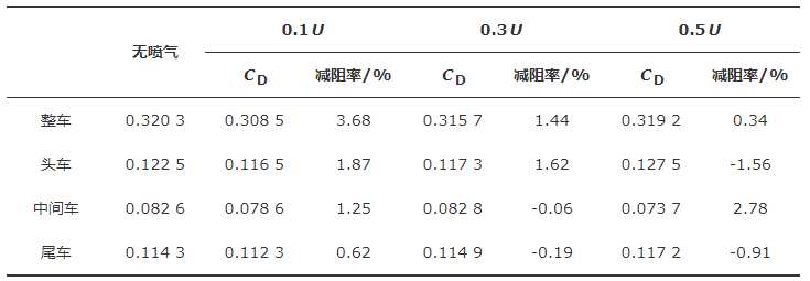 1)车身顶面喷气时,喷气速度为0.1U具有最佳气动减阻效果,减阻率约为3.68%,随着喷气速度提高,阻力系数上升,减阻效果减弱,当喷气速度为0.3U和0.5U时,减阻率分别为1.44%和0.34%。由各节车在不同喷气速度下摩擦阻力变化可知,当喷气速度较低时对各节车均有减阻效果,而喷气速度越高,对中间车和尾车的减阻效果越差,甚至产生增阻效果。