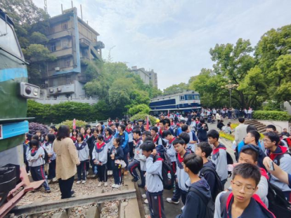 轨道交通科普基地进行参观实践。来自浏阳长郡实验学校的同学们在基地志愿者的带领下,分批次有序地参观了科普基地的实车碰撞实验室和气动实验室,以及铁路园的列车模型。