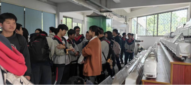 而在气动实验室,同学们通过志愿者的介绍了解到我校的试验平台是世界上实验速度最高、实验能力最先进的试验台之一,曾获得了国家科学技术进步二等奖。志愿者详细讲解了该平台的三大关键技术,即瞬态加速技术以及与之匹配的瞬态测量技术和瞬态制动技术。大家还了解身后的各种轨道交通列车的动模型,包括高铁,地铁与城市轨道交通等。同学们对这些模型具有很浓厚的兴趣。通过它们,同学们了解到了我国列车发展的历史与前景。大家通过两个实验室,了解到了我国对于铁路科研工作的重视,体会到了科技强国的具体含义,也感受到了国家对于铁路工作者和乘客的安全的重视。